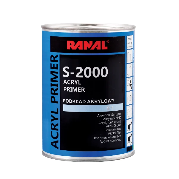Грунт акриловий Ranal S-2000 5+1 0,8л графіт з затв. 0,16л - двокомпонентний акриловий грунт класу MS має хороші наповнювальні властивості. Легкий у застосуванні, забезпечує гарне розтікання і гарне укривання грунтованої поверхні.